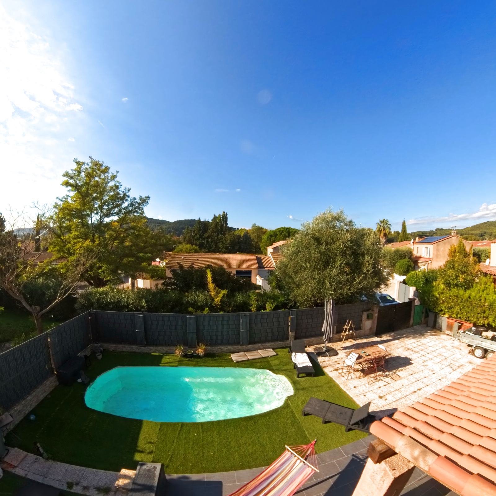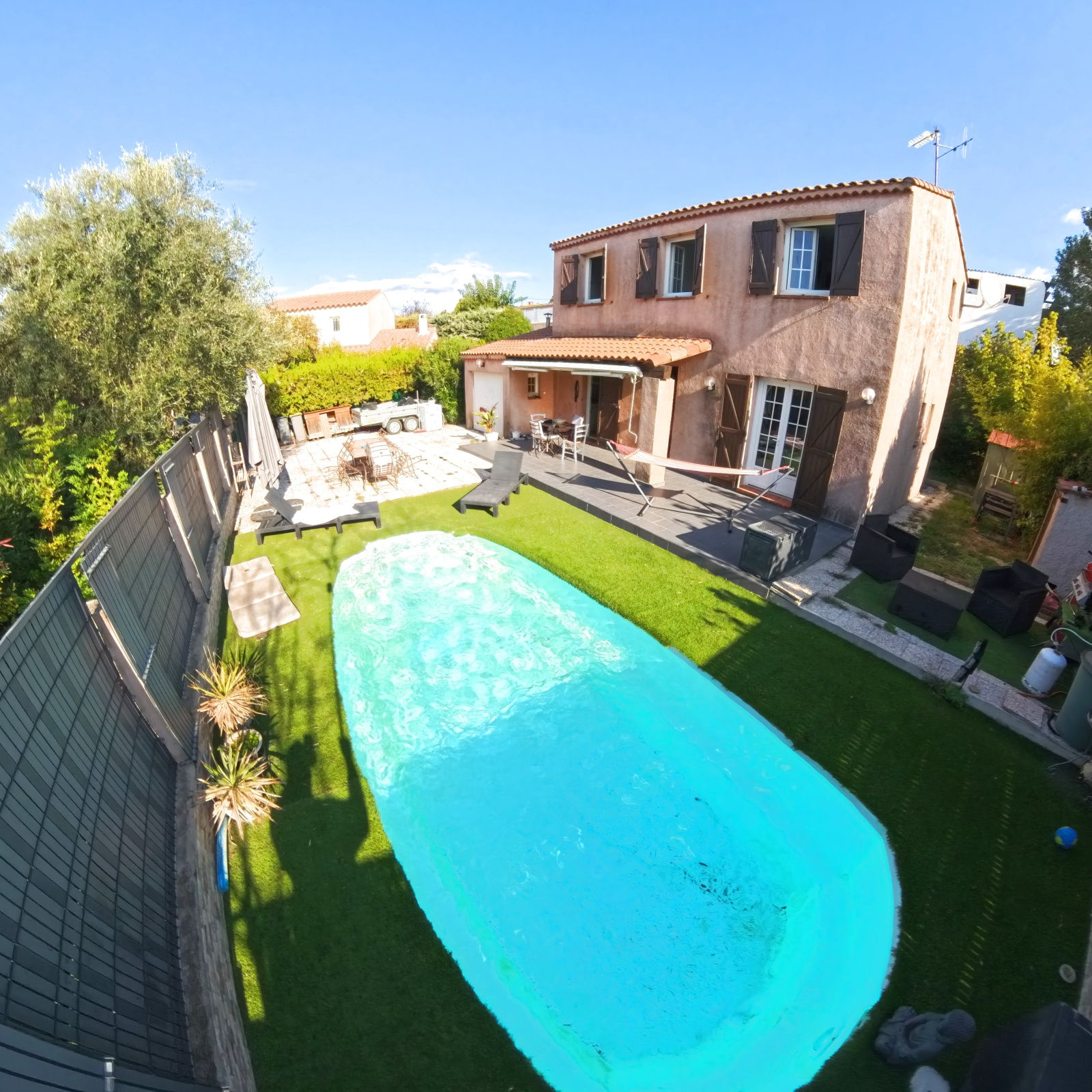 92m² sur une parcelle de 366m² avec une terrasse couverte + un garage attenant de 12m² et une piscine en coque