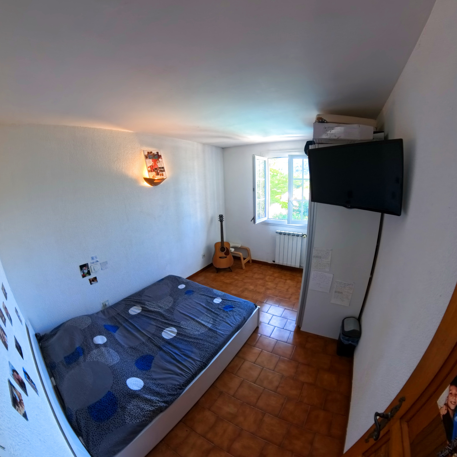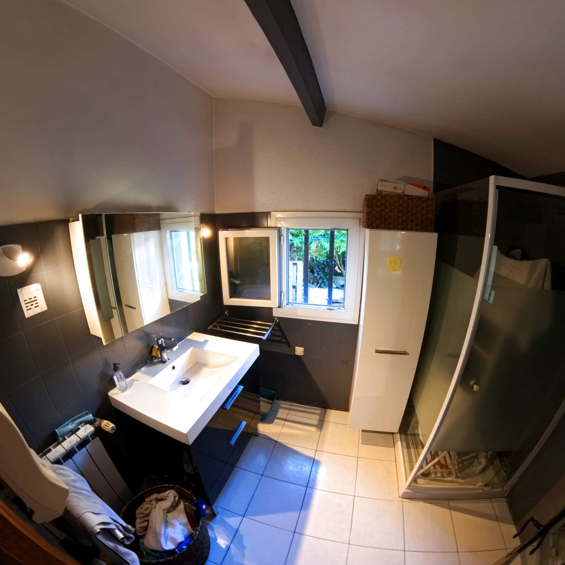 A l'étage : 3 Chambres de 9m², 9,5m² et 10m². Une salle de bain double vasque et WC indépendant.